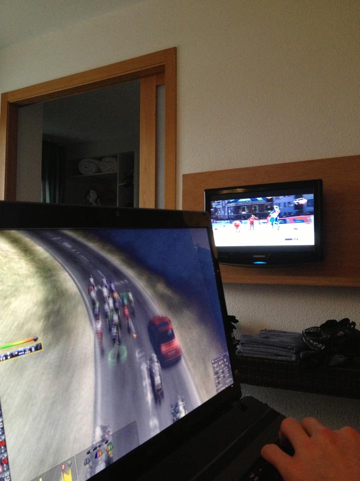 Her er altså utsiktet jeg har hatt store deler av dagen, ski på tv og sykkelspill på pc sammen med Simen.