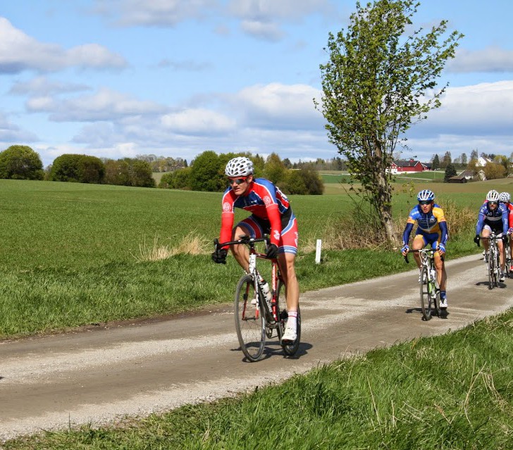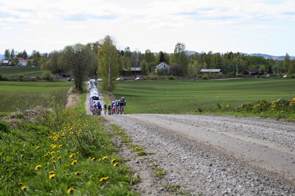 Joker sprengte etterhvert feltet i vinden på de smale grusveiene, jeg følte meg sterk å etter å ha kjørt meg opp fra små gruppe til smågruppe ble jeg liggende i en 3 manns jaktene like bak. Dessverre var verken jeg eller de jeg var med sterke nok så vi samlet oss i det som etterhvert ble en megen lite hovedfelt. Foto: Øyvind Nesdal